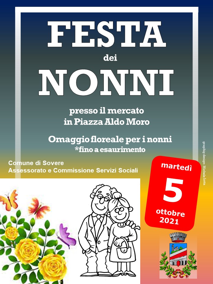 In occasione della Festa dei Nonni, istituita come ricorrenza civile con legge n. 159 del 31 luglio 2005, l'Assessore e la Commissione Servizi Sociali del Comune di Sovere martedì 5 ottobre 2021 saranno presenti con uno stand presso il mercato in Piazza Aldo Moro per distribuire un omaggio floreale a tutti i nonni soveresi (sino ad esaurimento).