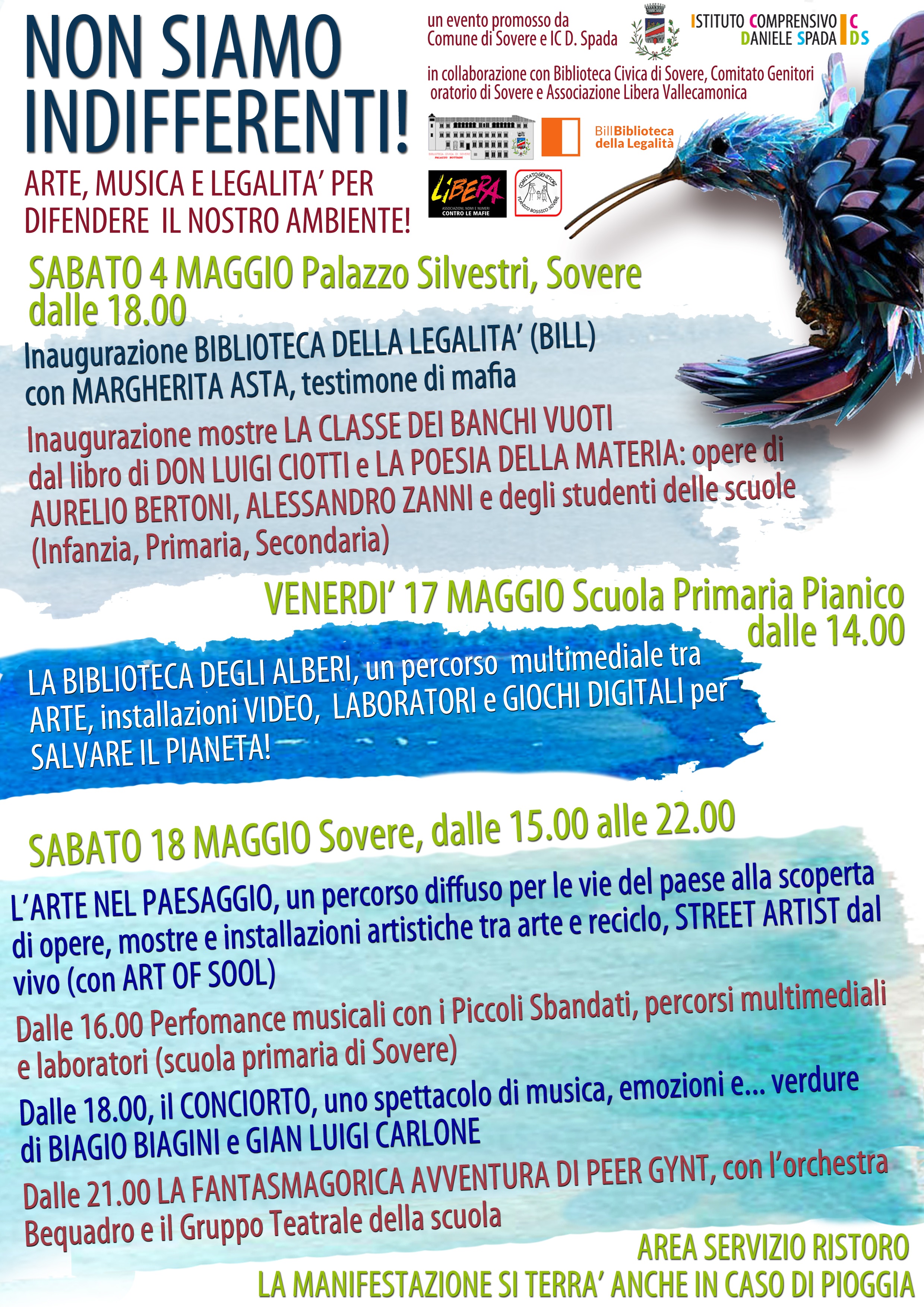 Il Comune di Sovere e l'Istituto comprensivo "Daniele Spada" organizzano l'iniziativa dal titolo "Non siamo indifferenti!", una grande manifestazione di arte, musica, spettacoli ed incontri per riflettere tutti insieme sul nostro ambiente e sul pianeta. Programma: