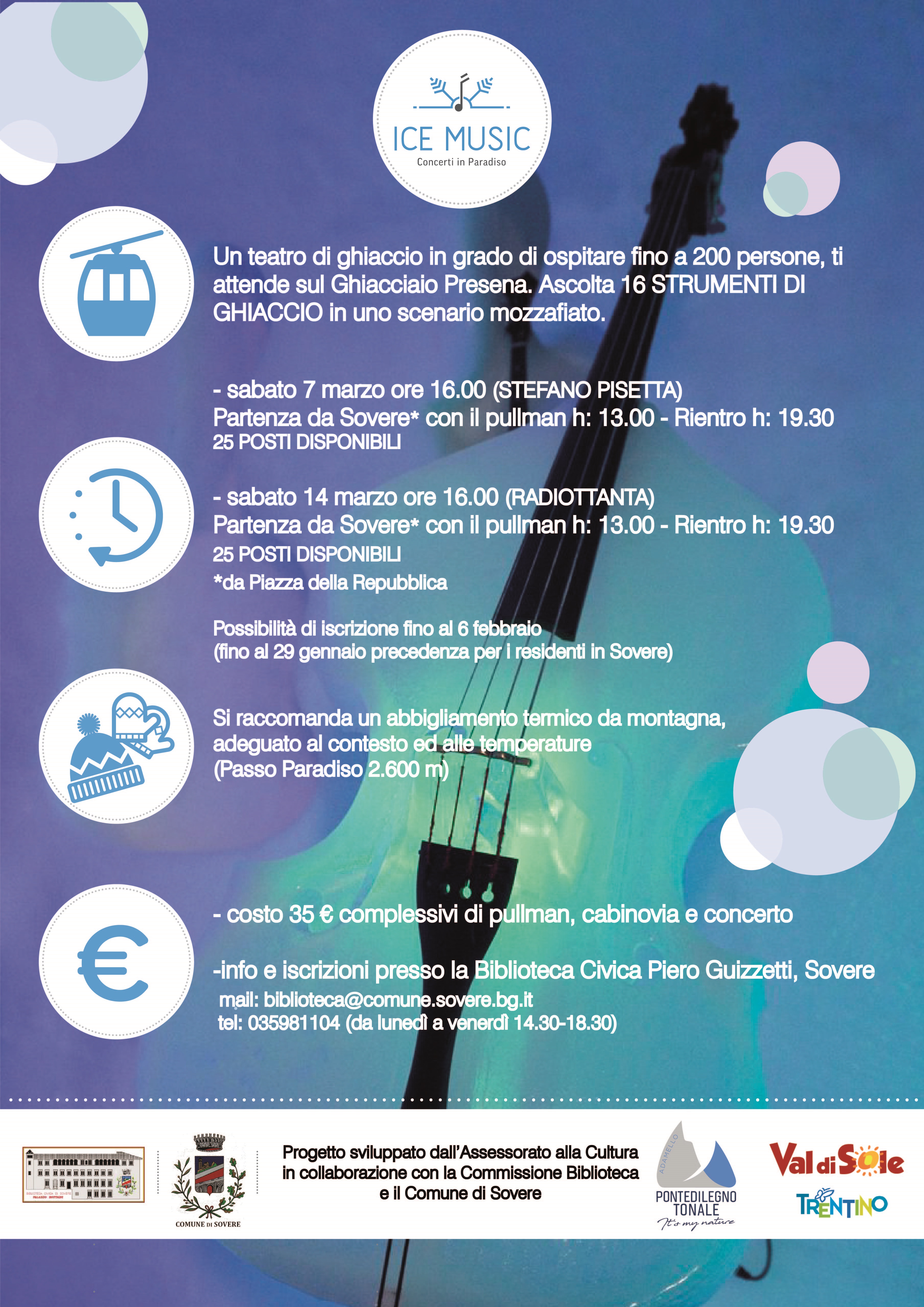 L'Assessorato alla Cultura, in collaborazione con la Commissione Biblioteca ed il Comune di Sovere, organizza due uscite al teatro di ghiaccio allestito a 2600 metri sul Ghiacciaio Presena per assistere a performance musicali uniche realizzate suonando strumenti di ghiaccio.