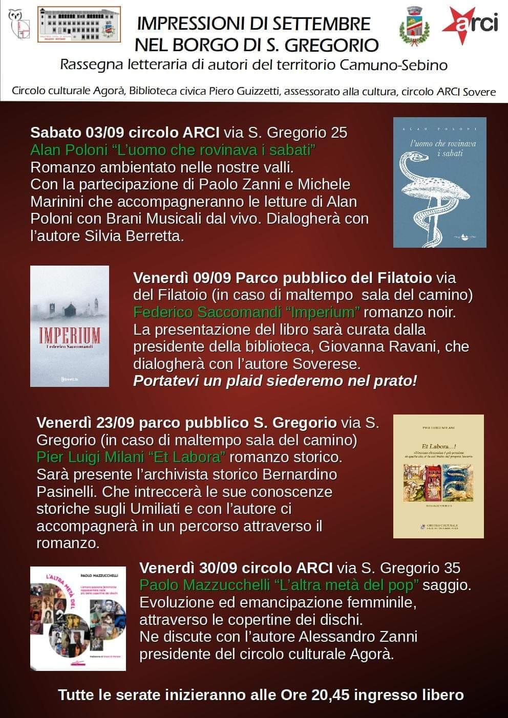 "IMPRESSIONI DI SETTEMBRE NEL BORGO DI SAN GREGORIO" è la nuova e interessante rassegna letteraria che vedrà la partecipazione di autori del territorio Camuno - Sebino organizzata da Circolo Culturale Agorà, Biblioteca Civica Piero Guizzetti, Assessorato alla Cultura e Circolo ARCI Sovere.Gli appuntamenti, tutti i programma alle ore 20.45 sono i seguenti: